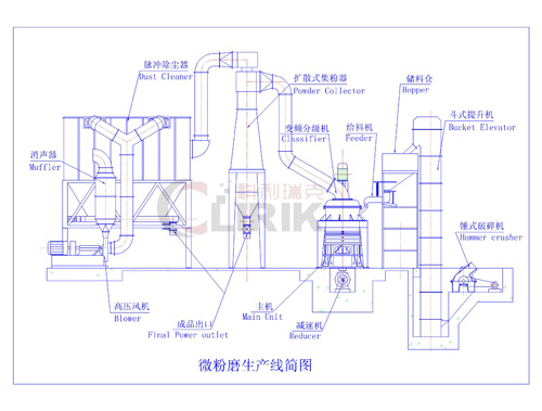 碳酸钙超细磨粉机的设备组成全套配置包括锤式破碎机、斗式提升机、储料仓、震动给料机、微粉磨主机、变频分级机、双联旋风集粉器、脉冲除尘系统、高压风机、空气压缩机、电器控制系统。